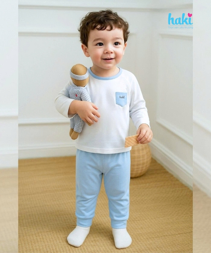 Bộ dài tay cài vai phối màu sợi tre Haki được làm từ chất liệu đang rất được ưa chuộng hiện nay là vải Bamboo cao cấp với đặc tính thấm hút mồ hôi tốt, thông thoáng, dễ chịu, co giãn và đàn hồi. Kiểu áo cài vai kết hợp phối màu Xanh-Trắng tinh tế, tăng thêm nét đáng yêu cho bé.