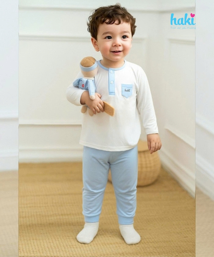 Bộ dài tay cổ trụ phối màu sợi tre Haki sử dụng chất liệu vải sợi tre (Fiber Bamboo) cao cấp mềm mại, kết hợp phồi màu Xanh-Trắng tinh tế, tươi sáng, kiểu quần áo dài tay cho bé mặc 4 mùa đặc biệt khi nằm điều hòa, phù hợp cho các bé từ 6kg tháng trở lên.