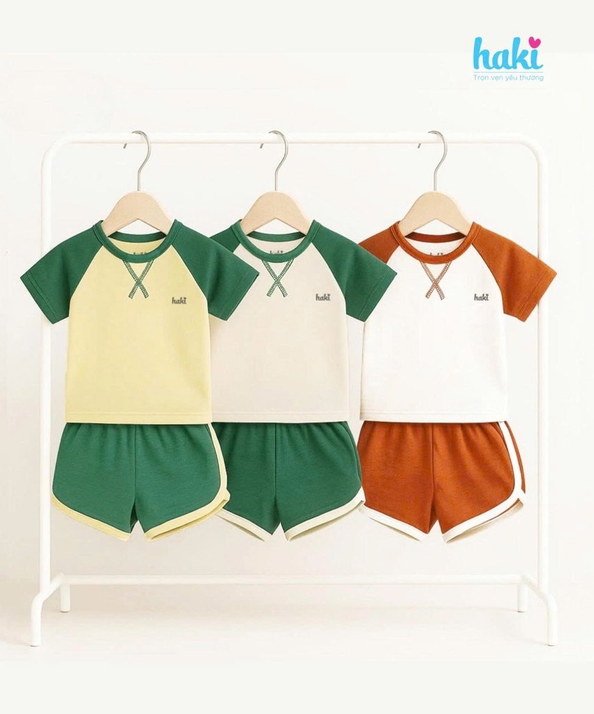 May từ chất vải tre, bộ cộc tay phối màu cổ tròn Haki nổi bật với đặc tính dệt từ 95% Bamboo cao cấp mềm mại, thấm hút mồ hôi tốt dành cho bé từ 4kg trở lên. Kiểu áo cộc tay kết hợp với quần đùi ngắn cho trẻ thoải mái hoạt động vui đùa, đặc biệt màu sắc phối màu tươi sáng, tôn lên làn da của bé.