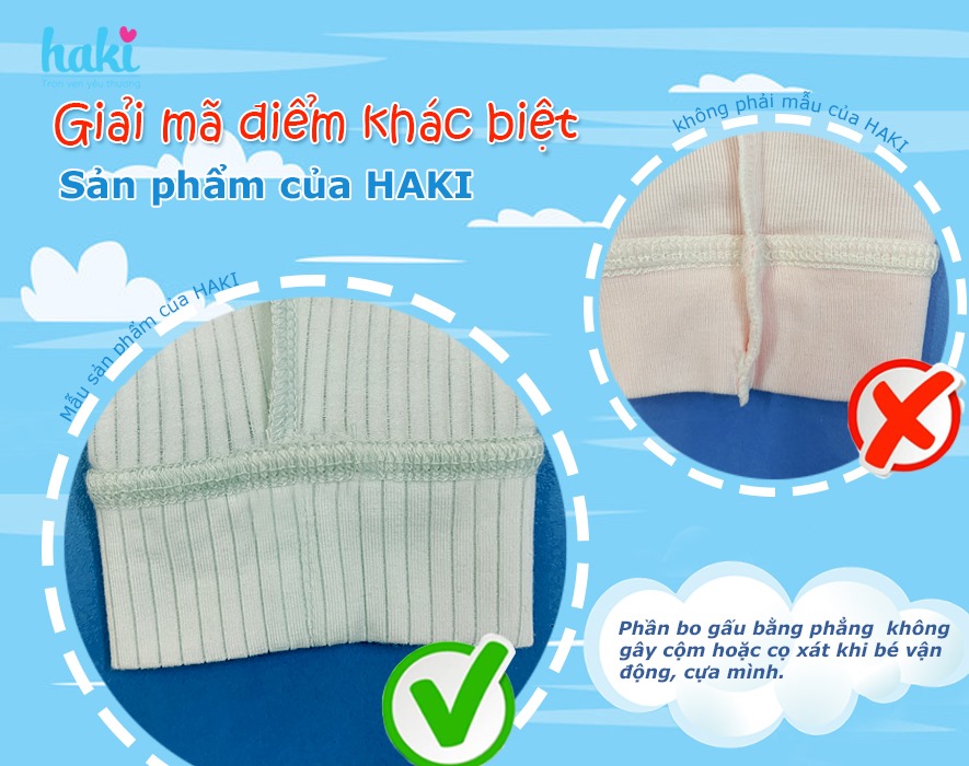 Hiểu được làn da bé yêu rất mỏng manh, nhạy cảm, nên HAKI đã nghiên cứu và thiết kế toàn bộ các phần 𝙗𝙤 𝙘𝙤̂̉ 𝙩𝙖𝙮, 𝙗𝙤 𝙘𝙤̂̉ 𝙘𝙝𝙖̂𝙣 𝙠𝙝𝙤̂𝙣𝙜 𝙘𝙤̀𝙣 đ𝙪̛𝙤̛̀𝙣𝙜 𝙜𝙖̂𝙣 𝙢𝙖𝙮 𝙧𝙖́𝙥 𝙣𝙤̂́𝙞 gồ lên cọ vào da em bé, gây khó chiu, ngứa ngáy hoặc có thể gây mẩn da nếu như sợi vải cứng và sợi chỉ sử dụng không đạt tiêu chuẩn an toàn.