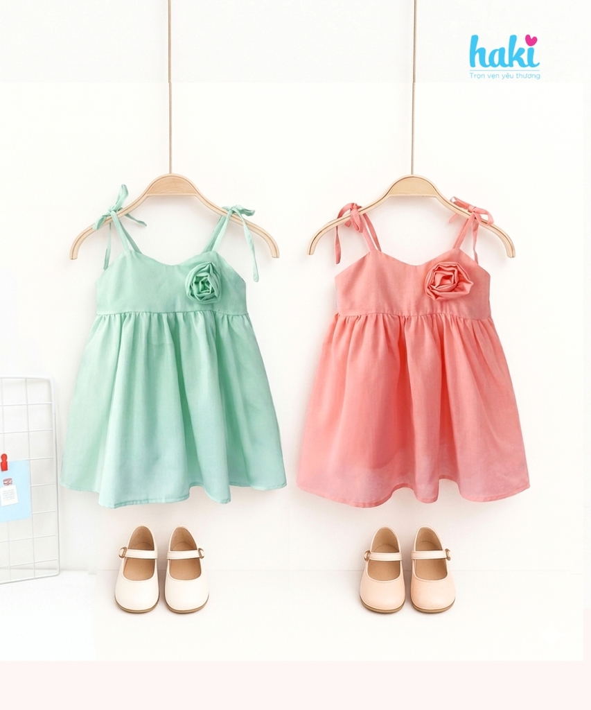 Váy hai dây đính hoa hồng của Haki với dáng dáng xòe hai tầng bồng bềnh gắn hoa hồng trước ngực xinh xắn kết hợp cùng chất liệu thô mỏng nhẹ, thấm hút mồ hôi tốt giúp bé thoải mái chạy nhảy, nô đùa chẳng ngại thời tiết oi nóng. Đặc biệt, váy còn được thiết kế với phần buộc dây trên vai có thể tùy chỉnh theo ý muốn.