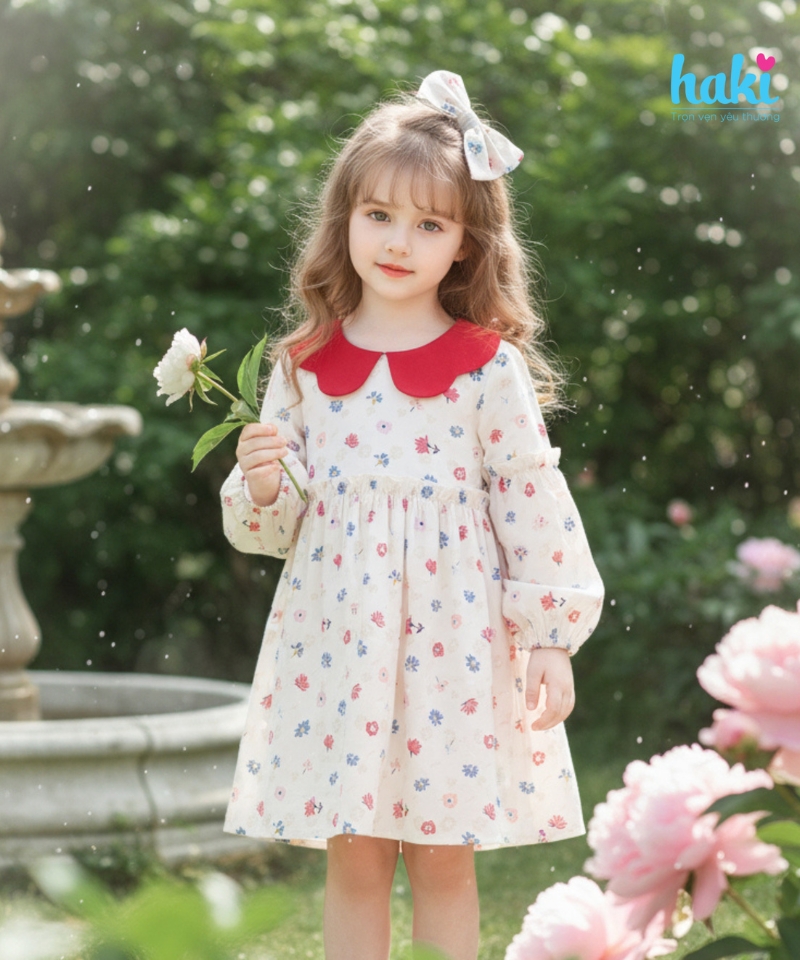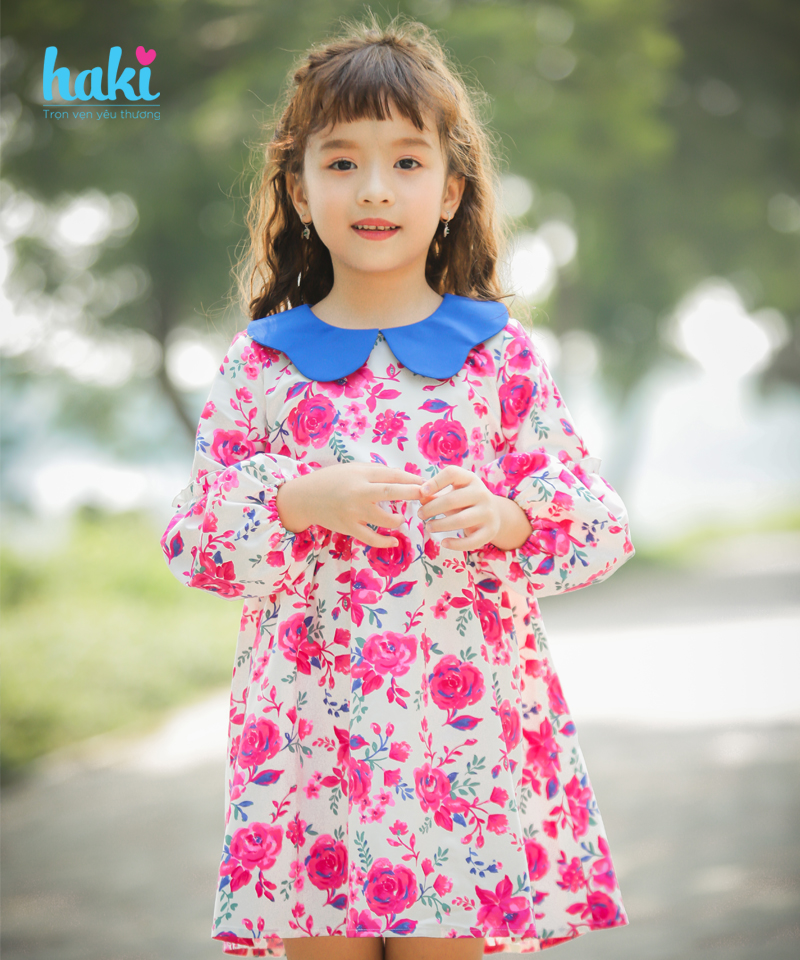 Có thể nói mẫu Váy hoa bèo tay cổ Peter Pan sắc màu chính là điểm cuốn hút của toàn bộ BST Thu - Đông của Haki, một nét đột phá và ấn tượng trong phong cách của bé. Chất liệu vải thô mềm mại, điểm xuyết những hoa văn lớn nhỏ đẹp mắt tạo nên phong cách cổ điển, quý phái mà không bộ trang phục nào mang lại được. Phần phần tay thiết kế bồng bềnh với 1 lớp bèo nhún, cổ áo ""peter pan"" cách điệu nổi bật được pha phối ""ton sur ton"" với họa tiết trên vải khiến bé trở nên nữ tính va dịu dàng hơn.
